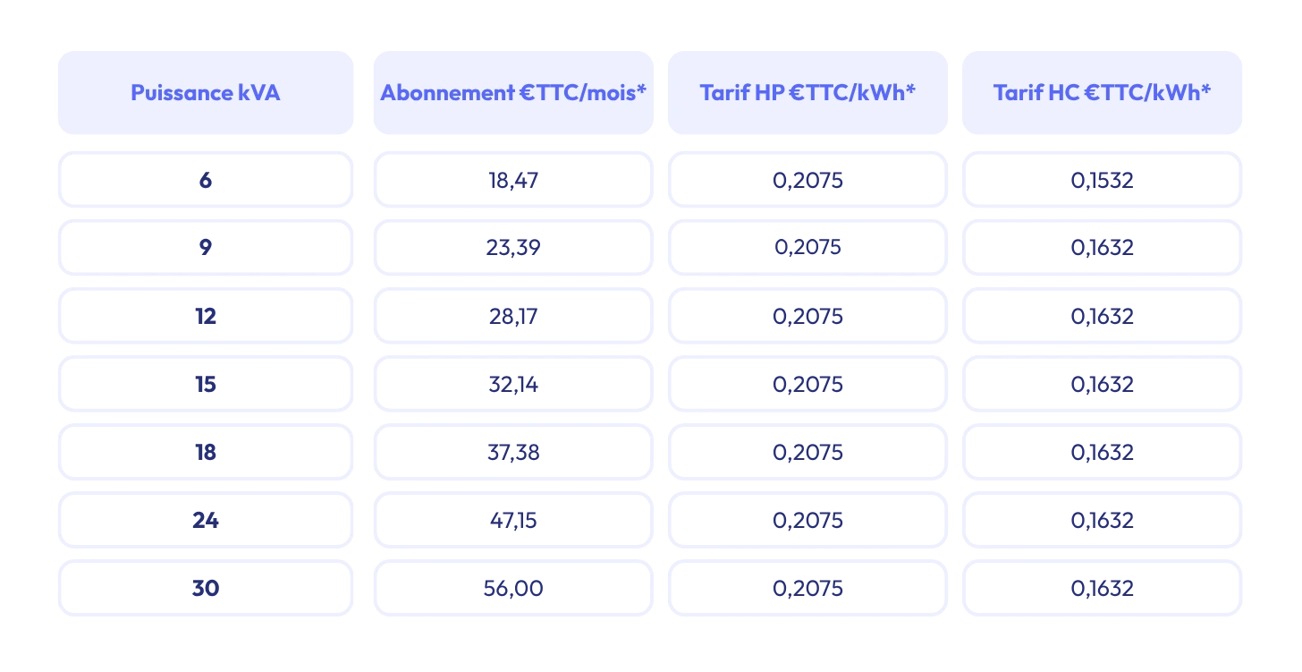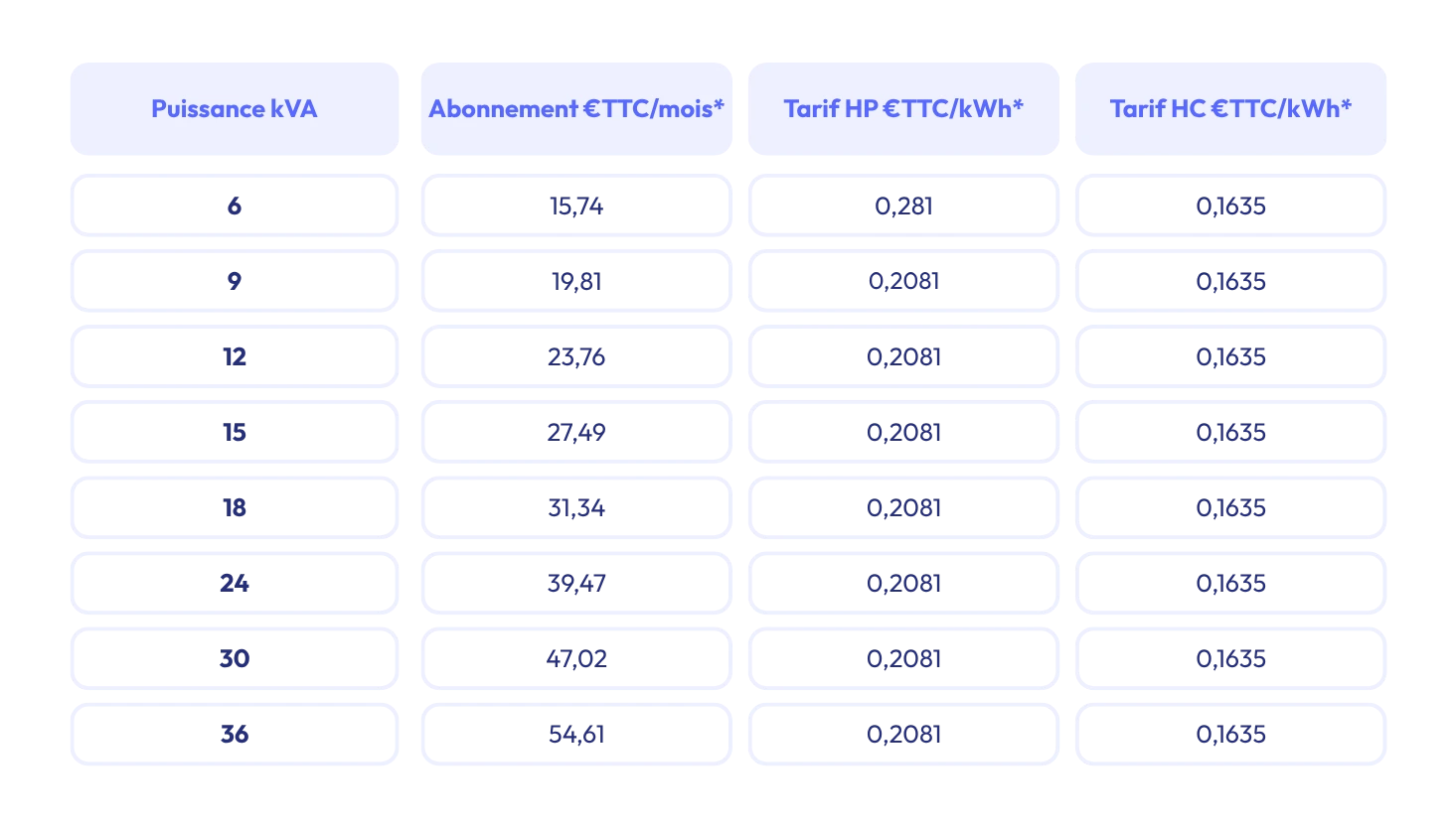 - Heures pleines (HP) : la majorité de la journée (généralement 16h/jour), où le tarif du kWh est plus élevé.
